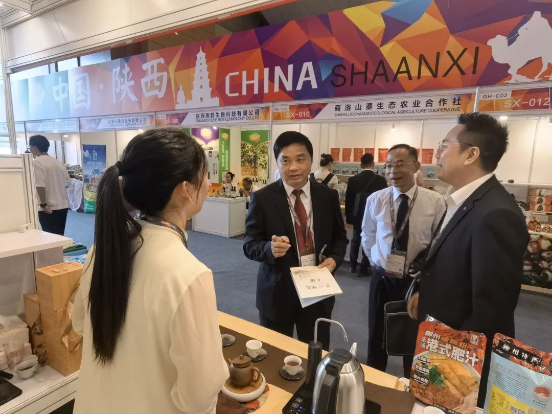 自治区商务厅二级巡视员黄家生及自治区质量检验研究院副院长李君平莅临六堡茶公司展位品茗六堡茶