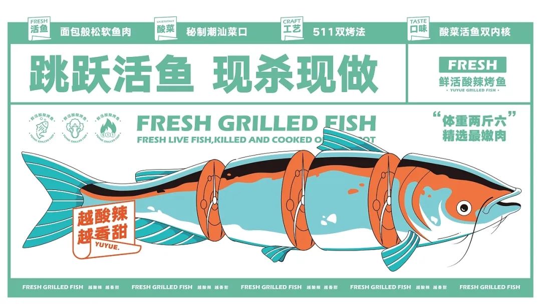 我们决定包装酸辣烤鱼为爆品,抢先将酸辣烤鱼与渔越划上等号,并向上挖掘酸的根源,向下延仹酸开胃、刺激味蕾的舒爽独特体验。