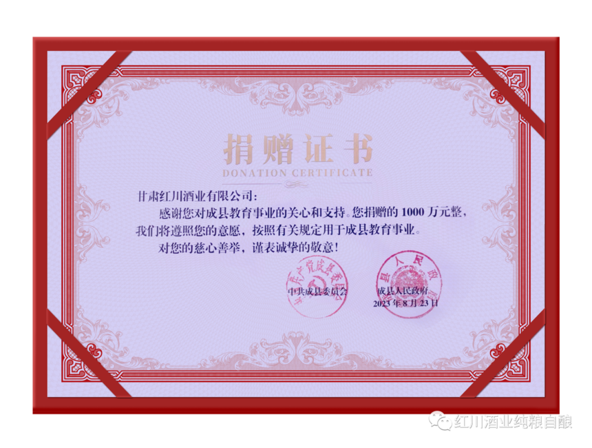 践行企业使命,担负社会责任,不断回馈社会。这些年,红川酒业始终将企业发展与社会发展融为一体,先后在筑路修桥、抗灾救灾、助力脱贫、乡村振兴、抗击疫情、城市建设等社会公益事业方面发展积极贡献红川力量,当天在成县教育振兴促进会成立大会上,为成县教育事业捐赠1000万元,累计捐赠已经超过9000万元。未来,公司将一如既往地支持教育事业发展、积极助力经济社会发展,不断贡献新的力量。