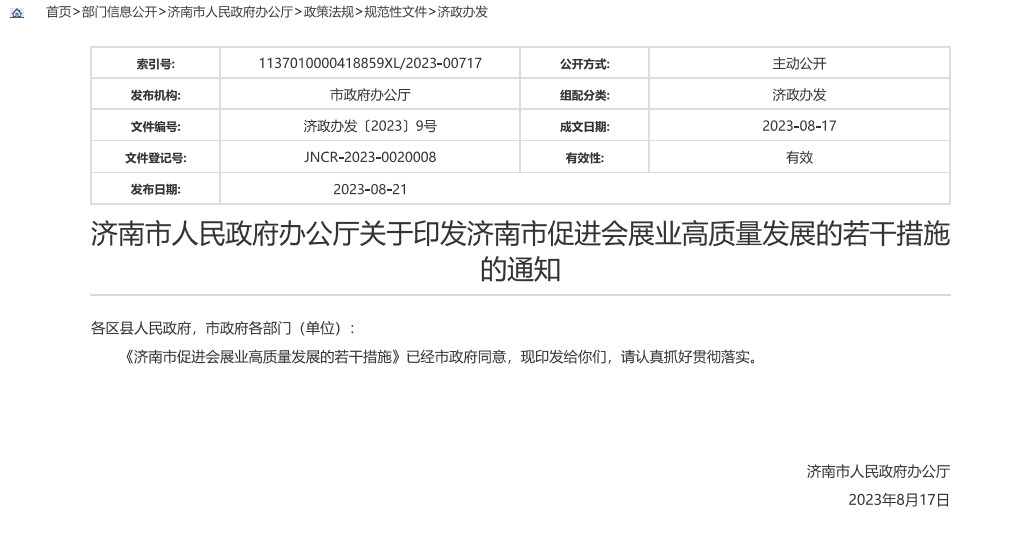 2023年8月17日,济南市人民政府办公厅印发了《济南市促进会展业高质量发展的若干措施》,主要内容如下:为全面提升我市会展业品牌化、数字化、国际化水平,促进会展业高质量发展,进一步增强会展业服务全市经济社会发展功能,加快建设国际会展名城,助推国际消费中心城市创建,结合我市实际,制定若干措施如下。