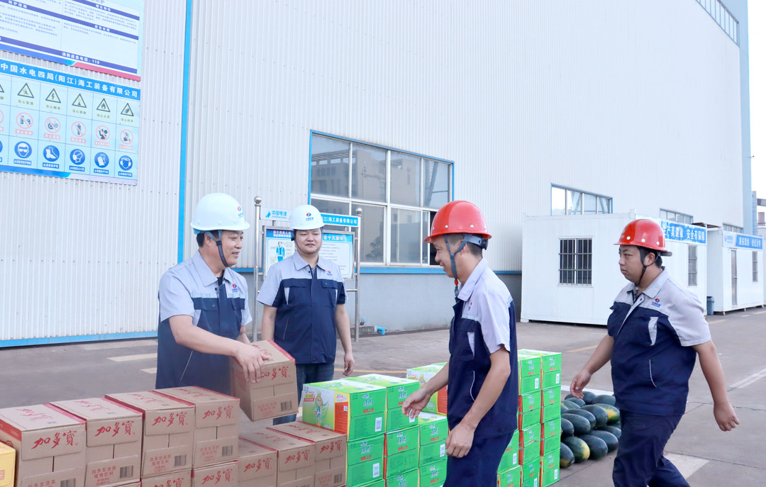 7月14日,阳江公司组织开展“深化主题教育 关爱一线员工”专项行动暨“夏送清凉”集中慰问活动。装备公司党委书记、董事长郭平俊参加慰问活动。此次集中慰问活动,阳江公司工会为每位员工准备了西瓜、清凉饮料等物资。会上,郭平俊向广大员工的辛勤付出表示了感谢,表达了装备公司的慰问和关怀,随后,带领慰问人员将慰问品一一发放到广大员工手里,并叮嘱大家要注意防暑降温。