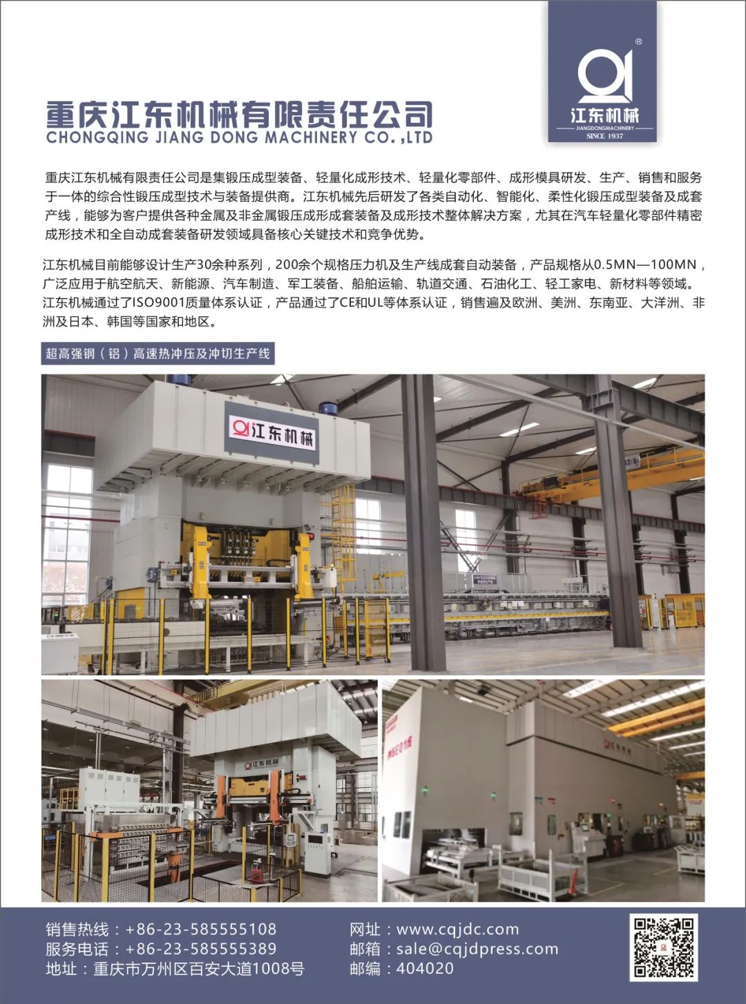 重庆江东机械有限责任公司是集锻压成型装备、轻量化成形技术、轻量化零部件、成形模具研发、生产、销售和服务于一体的综合性锻压成型技术与装备提供商。江东机械先后研发了各类自动化、智能化、柔性化锻压成型装备及成套产线,能够为客户提供各种金属及非金属锻压成形成套装备及成形技术整体解决方案,尤其在汽车轻量化零部件精密成形技术和全自动成套装备研发领域具备核心关键技术和竞争优势。