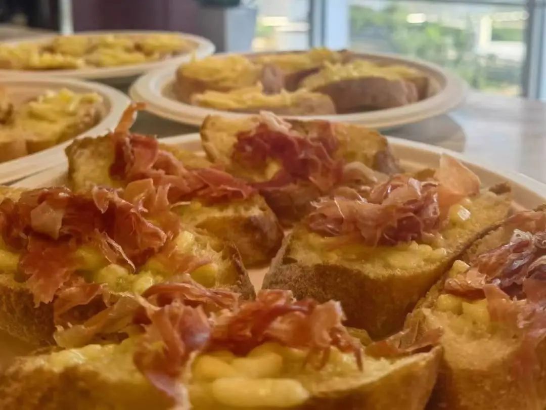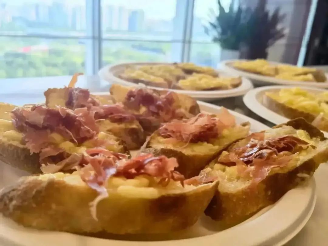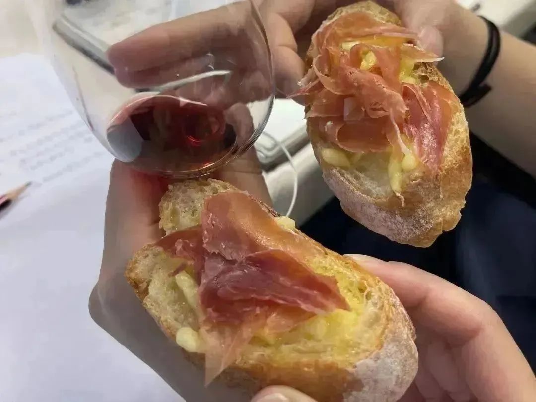 当大伙还沉浸在细细品味时,忽然飘进一股烤香味,什么情况?原来是Natacha和行政的同事为大家准备的现烤面包,伙伴们惊呼太有口福啦!刚出炉法式面包的酥脆口感,加上切成薄片的火腿与奶酪,再喝上一口富隆美雅红葡萄酒