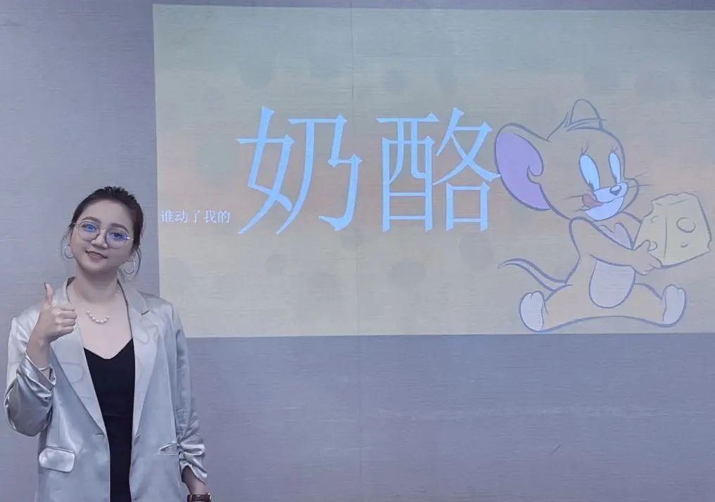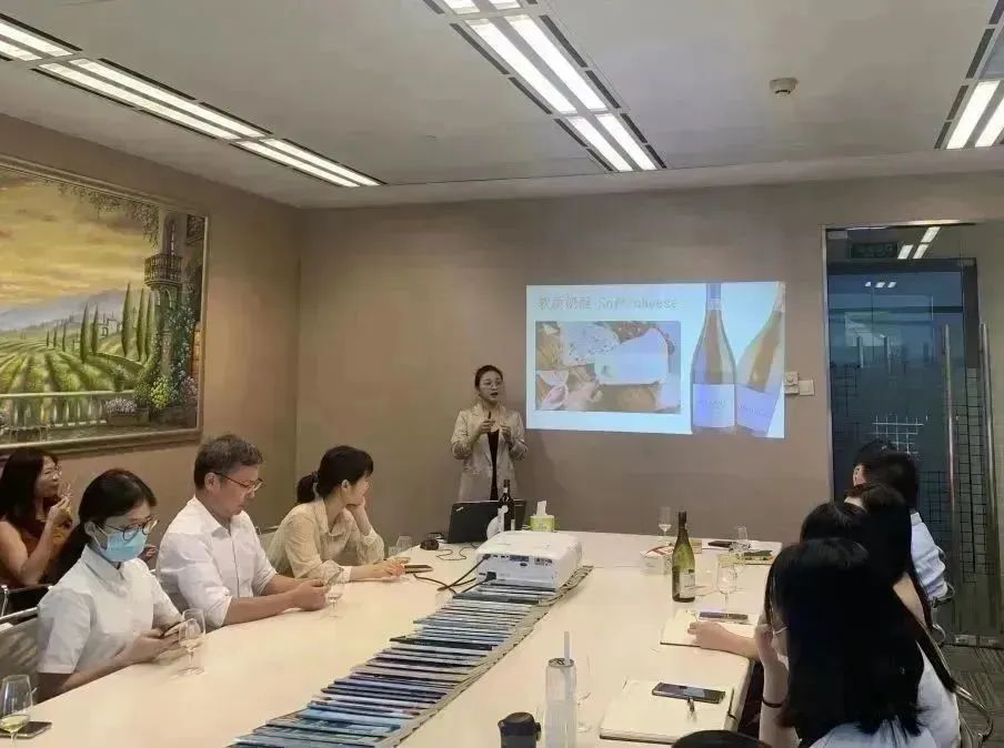 为了让大伙亲身感受奶酪与美酒的完美交融,公司为大家准备了不同品种的奶酪,以及两款令人陶醉的美酒佳酿。伙伴们品尝了第一款奶酪后,Emma老师问:“你们猜猜这是什么品种的奶酪?”