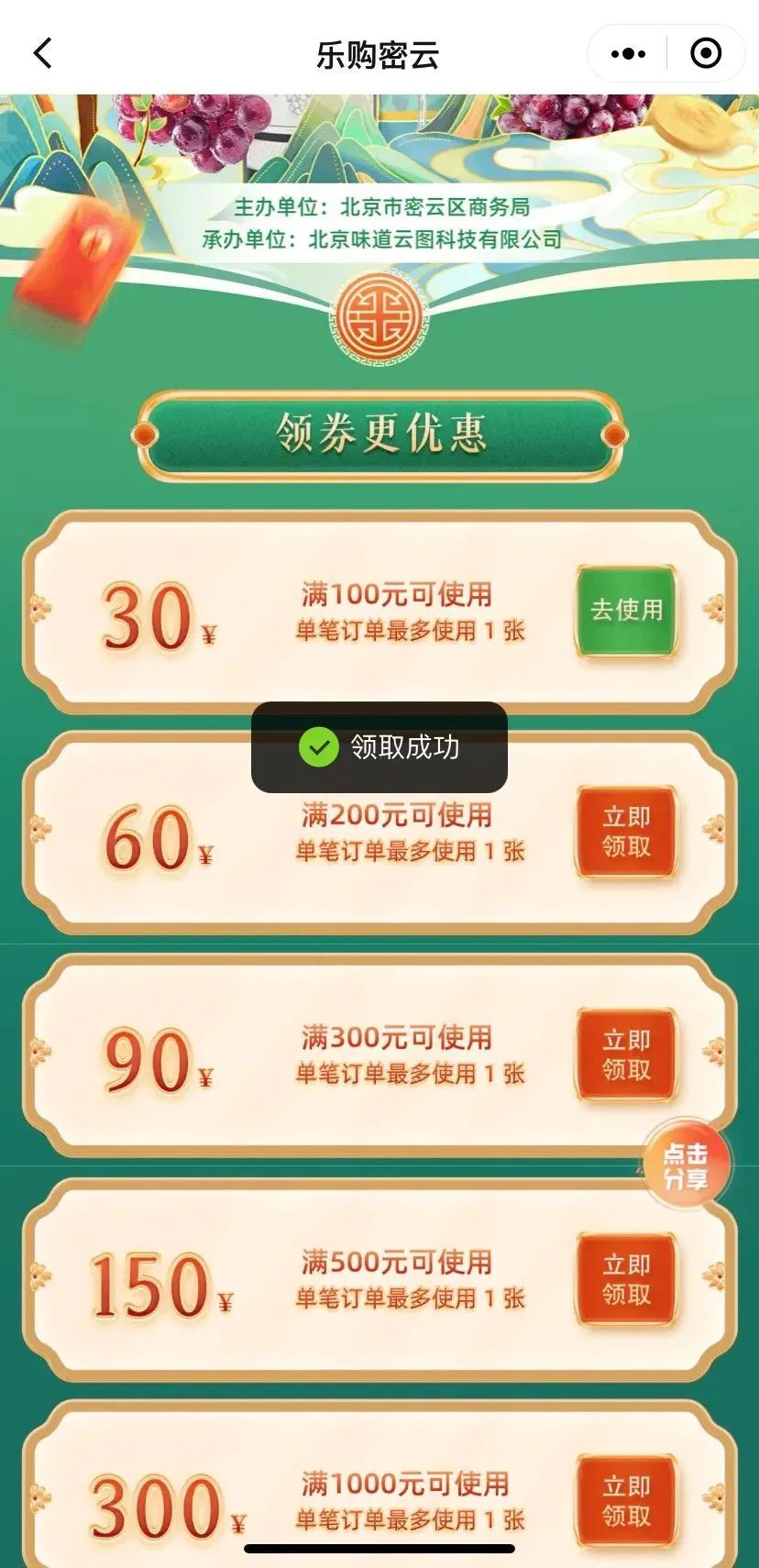 领取成功后,点击“去使用”即可查看领取到的消费券;