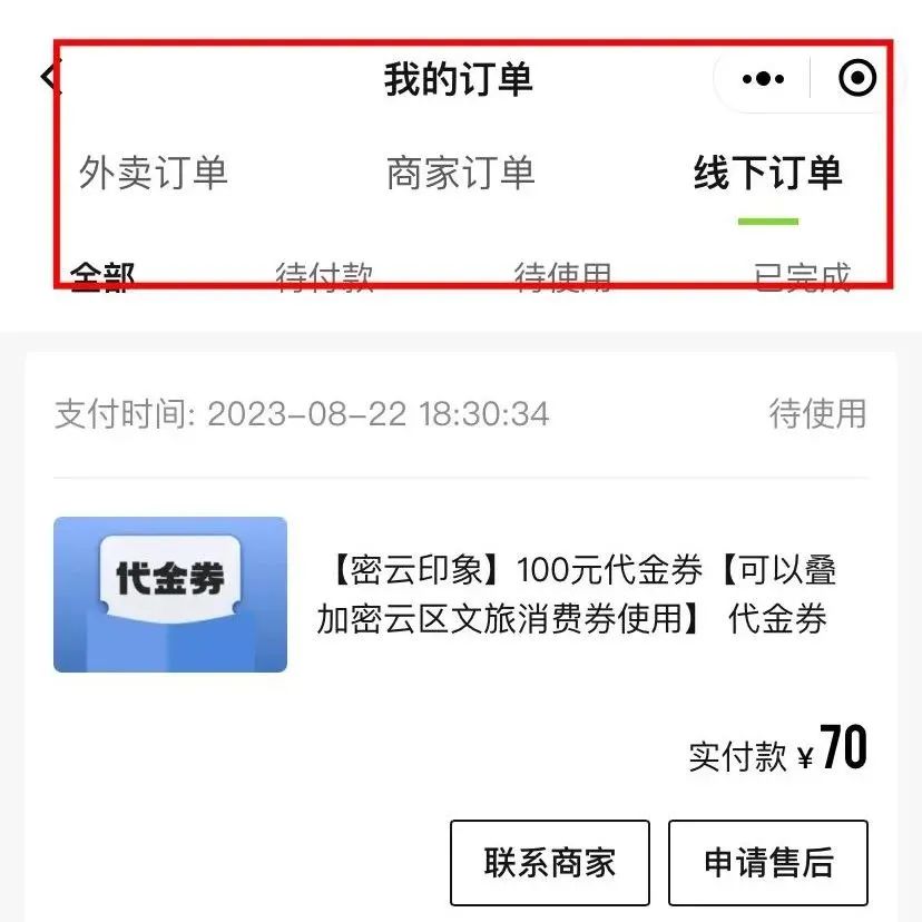 点击右侧“线下订单”,选择已支付的订单, 会弹出订单核销二维码,到店消费并将二维码出示给商家,即可完成抵扣。