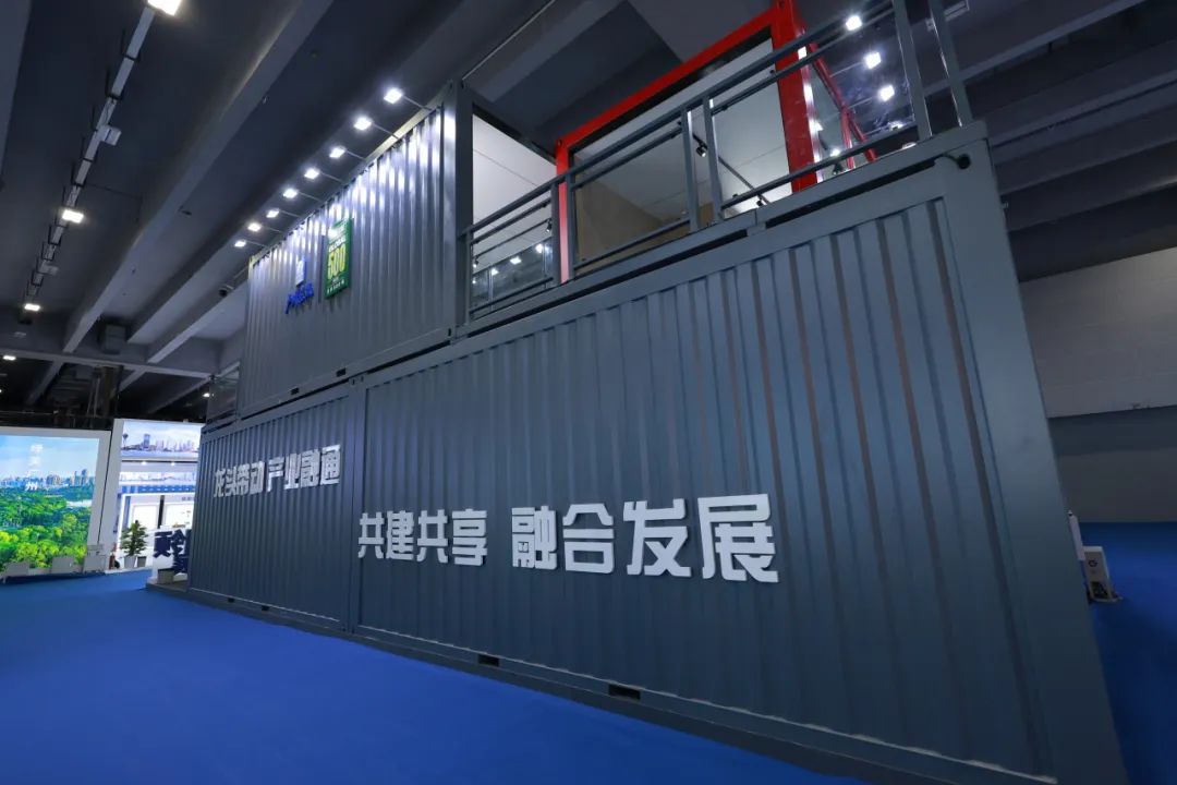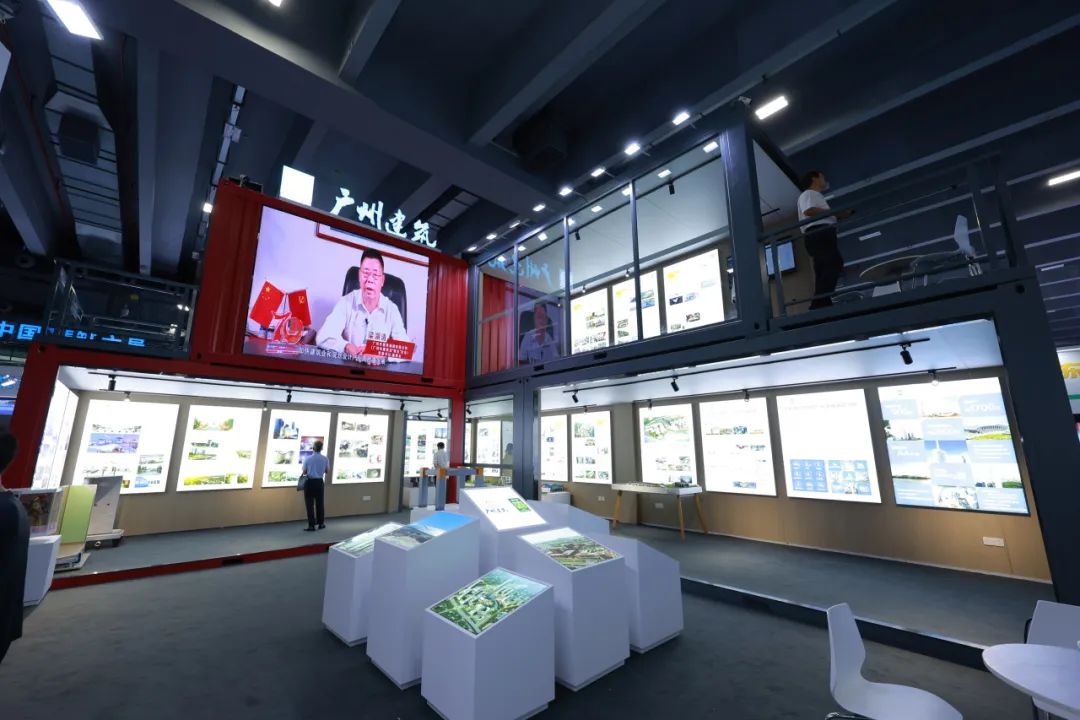 在展馆B区9.1馆A01展位,广州建筑设置了225平方米的展厅。属下市政集团利用组合式集装箱+MiC构件进行布置,将其打造成为全场唯一一个双层复式结构展厅。结合大会主题,展厅分板块展示了集团公司近年来在投资、研发、设计、建造、咨询、运维、城市更新等七个主产业链和人才链、供应链、信息链、服务链、资金链等五个延伸链方面的发展优势和成绩。