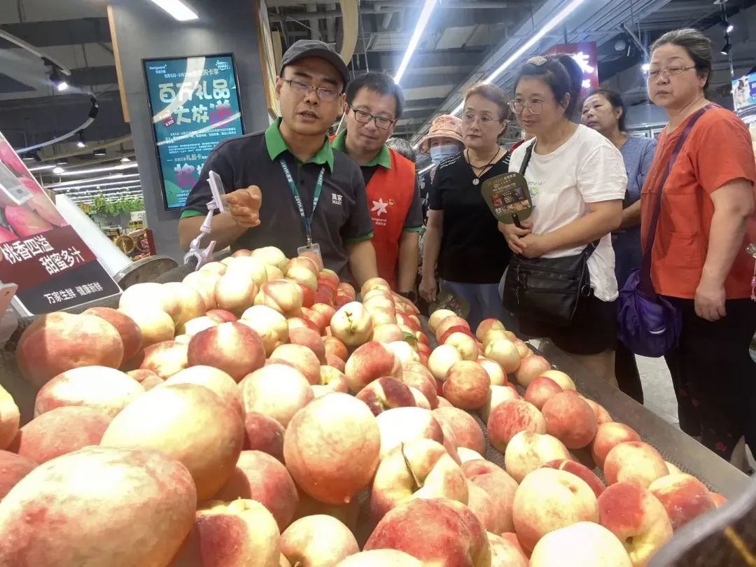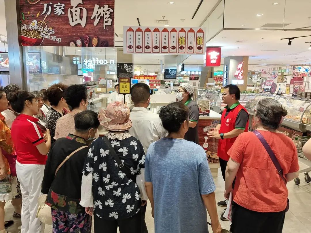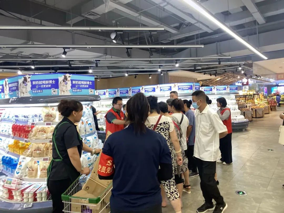 在蔬菜肉品区,门店党员们为大家讲解如何挑选新鲜的蔬菜瓜果,以及如何选购预包装食品等小常识;在日配低温奶区,参观的居民们多是一些老年人,党员们帮助他们线上下单购买牛奶等商品,帮助他们以最优惠的价格购买所需商品。结束参观后,社区居民纷纷品尝了熟食自制品,并加入门店的社区微信群。