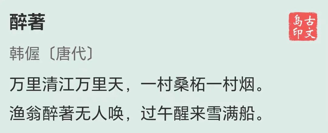 这一首比较通俗易懂,很容易想象到那个场景,最喜欢它的意境美,宁静而闲适,尤其是最后一句“过午醒来雪满船”,真的直击内心,有点羡慕一个渔翁。