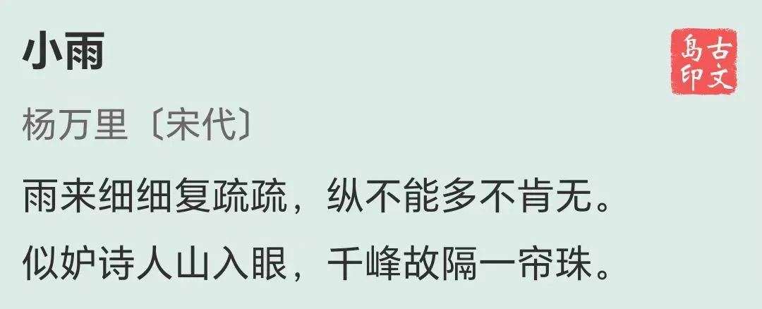 后两句就特别有意思,杨万里很会开玩笑:小雨好像嫉妒我太喜爱那远处的青山,所以才从屋檐下滴滴答答形成珠帘遮挡我的视线。