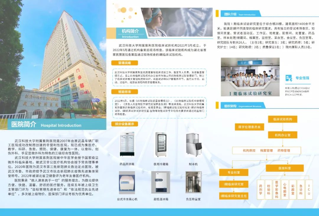 我院I期临床试验研究室位于医院综合大楼20楼,占地1400平方米,设60余张床位,用于开展I期药物临床研究。