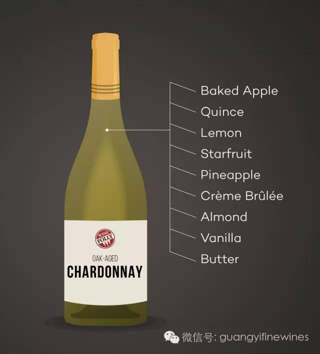 在橡木桶中陈酿并进行过苹果酸转换的Chardonnay会有crème brûlée法国焦糖蛋奶冻, vanilla香草和cream奶油的味道。