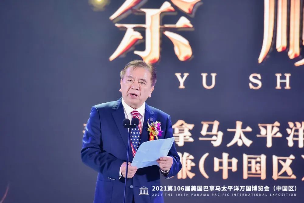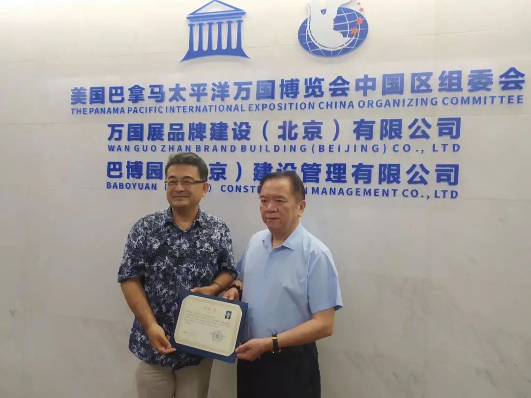 巴拿马太平洋万国博览会中国区组委会主席余顺标先生给任广斌先生授牌。