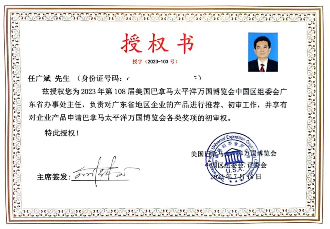 三、任广斌授权巴拿马太平洋万国博览会108届广东主任授权