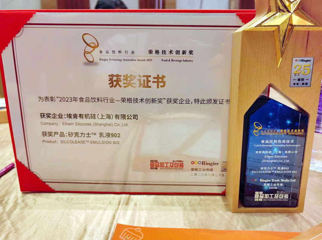 很荣幸埃肯有机硅水性离型剂SILCOLEASE™ EMULSION 902荣获2023食品饮料行业荣格技术创新大奖!
