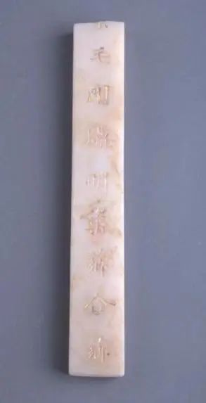 西北大学博物馆收藏的这块“汉白玉填金字玉册”是 1993 年西安市迎春小区改造时在一工地发现的,后由西北大学征集,现收藏于西北大学博物馆内。这块玉册有残缺,长度为 21.9 厘米、宽 3.2 厘米、厚1.5 厘米,平面形状呈长方形,汉白玉质,以楷书在其上刻有“毛刚腊明兹 乡和乡”字口贴金,古意指把猪羊放在小鼎中烹煮,使其香美。经过填金的玉册片,当光线从一定角度照射上去时,金的耀眼与玉的光润强烈却不违和地交织在一起,熠熠生辉,光彩动人。