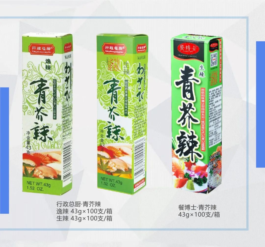 「行政总厨·青芥辣」原料全部采用享誉世界的“辣根之乡”山东临沭本地产特级辣根粉。味道纯正,风味独特,产品辣度全面提高,色泽嫩绿,易溶解,膜包技术使得产品溶解后辛辣感更加强烈。常应用于各种蘸碟之中,也可用于调制秘制酱汁,以及调拌各类凉菜,是您在制作各类美味佳肴中的秘密武器。