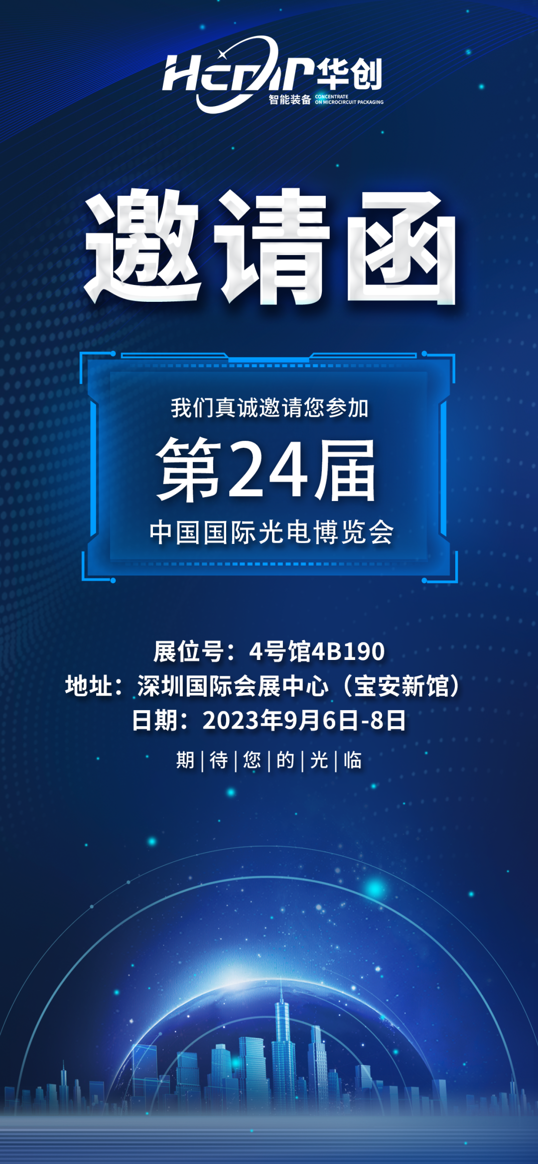 烟台华创将于2023年9月6日—9月8日参加位于深圳国际会展中心(宝安新馆)的第24届中国国际光电博览会,在此我司诚邀您的莅临,期待我们的见面!