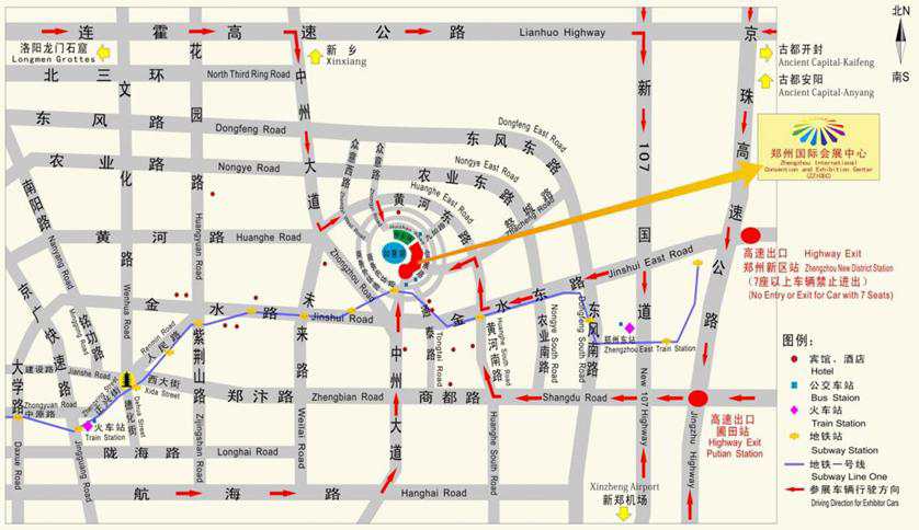 c.乘坐机场线至紫荆山站换乘地铁一号线至会展中心站下车(约 1 小时)