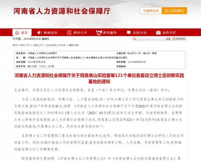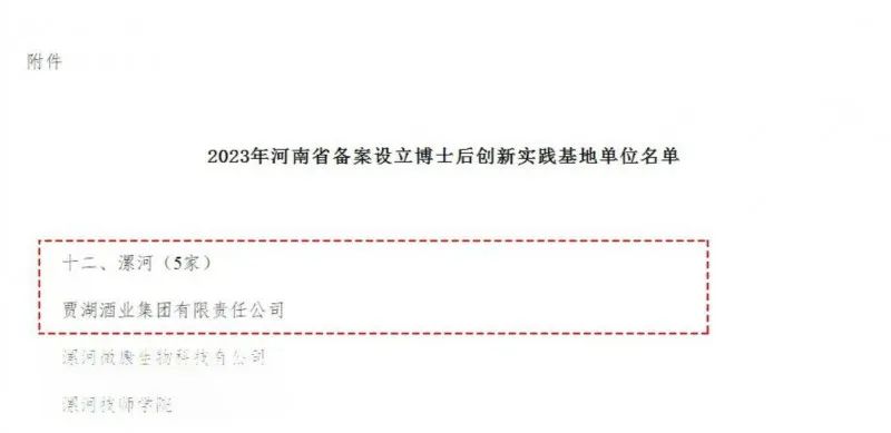 近日,河南省人力资源和社会保障厅公布了《2023年河南省备案设立博士后创新实践基地单位名单》,贾湖酒业集团成功获批设立河南省博士后创新实践基地,标志着贾湖酒业正式具备联合博士后流动站招收、培养博士后研究人员的资格及开展博士后技术创新实践活动。