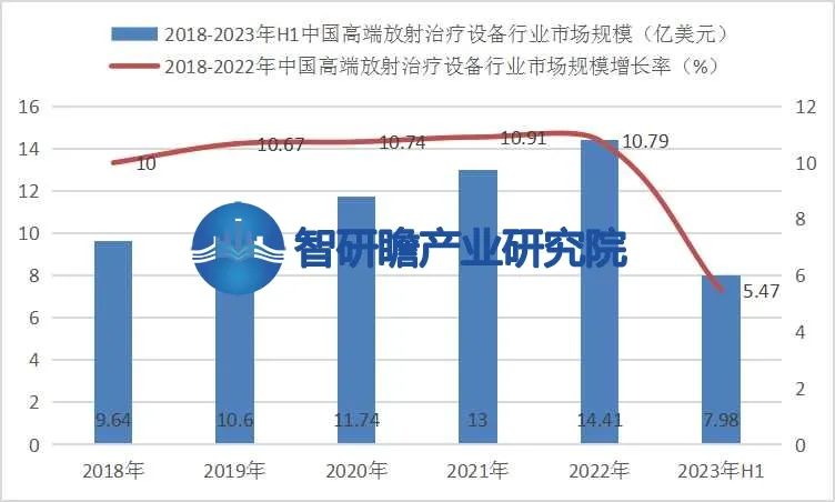 统计数据显示,2018年中国高端放射治疗设备行业市场规模9.64亿美元,增长率为10%。2023年H1中国高端放射治疗设备行业市场规模7.98亿美元,增长率为5.47%。2018-2023年H1中国高端放射治疗设备行业市场规模和增长率如下: