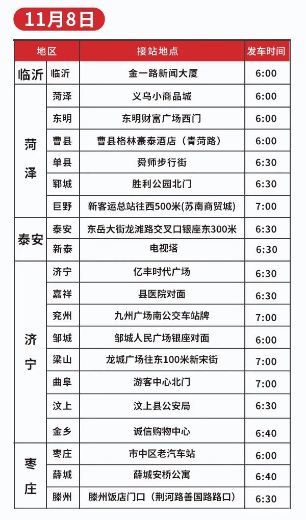 大巴车乘坐时间为11月8日以及11月9日,具体时间根据地区不同日期不同。(详见下方具体时间表)