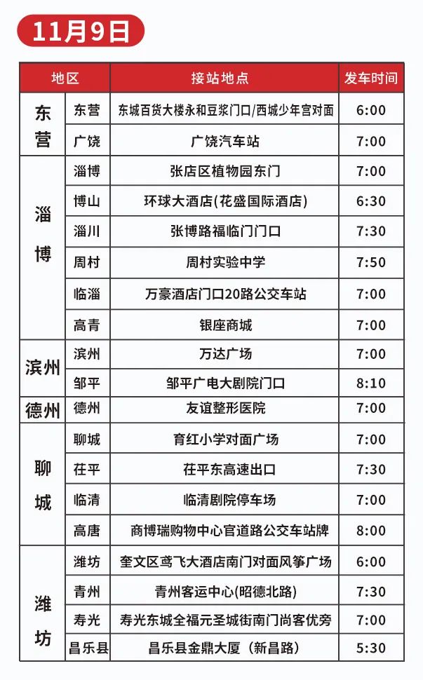 临沂、菏泽、泰安、济宁、枣庄、东营、淄博、滨州、德州、聊城、潍坊。(详细见下方大巴车时间表)。