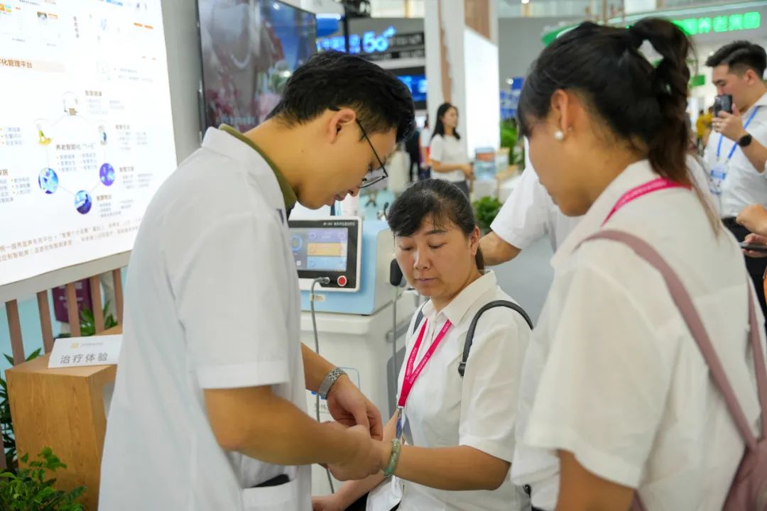 为民康复医院还在展会现场设立了线下义诊服务平台,为感兴趣的参会人员提供免费的诊疗服务。义诊平台大排长龙,现场有观展长者表示,没想到自己来观展还能顺带问诊,感觉为民康复医院的医生都十分专业,态度也很亲和。