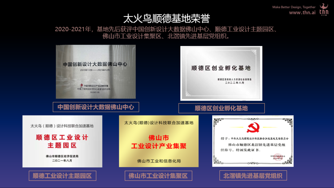 目前,太火鸟(顺德)基地已吸引超过40家工业设计及紧密关联企业入驻,拥有高新企业3家,科技型中小企业2家,佛山市专精特新企业1家,聚集设计研发人员超过100人。基地企业累计拥有知识产权数量40余项,获国内外设计大奖8项,入驻企业2021年营业收入总额超过2亿元。