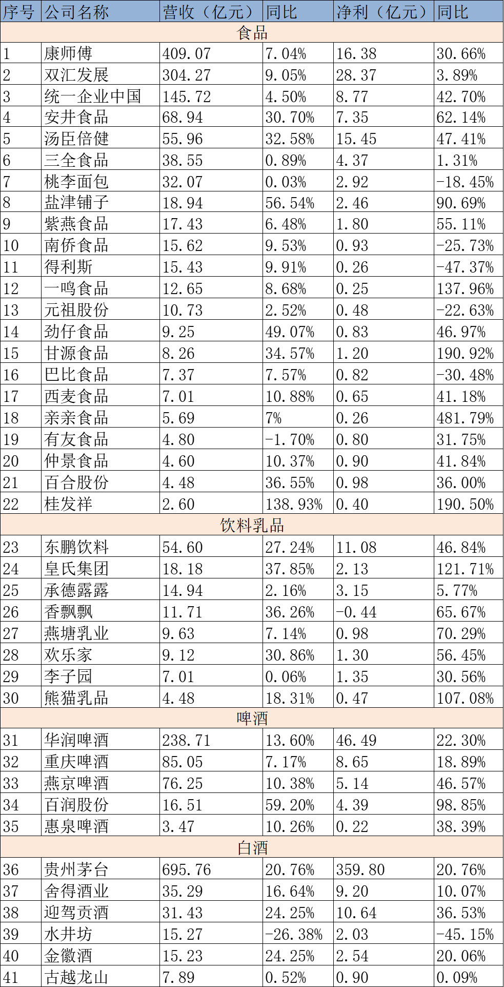 截至目前,已有多家食品饮料、酒水企业陆续发布2023上半年财报。笔者对相关41家上市企业的2023上半年业绩进行了盘点,并以不同品类划分,按照营收进行排序,共同分析营收以及净利数据。在整理的41家食品饮料、酒水企业中共有34家企业实现营收、净利双增长,占比达80%以上。财报的发布为我们提供了一个了解行业发展趋势的窗口,本篇我们将共同分析这些公司的业绩表现,探究其背后的原因和趋势,以便更好地理解行业现状以及未来的发展方向。 食品板块: