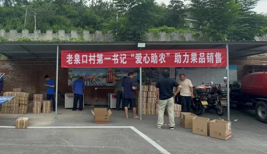 眼下正值大桃销售旺季,凌晨6:30,老泉口村委会大院就开始繁忙起来,桃农们拉着刚从山上摘下的鲜桃陆续到达,老泉口村驻村第一书记柳俊伟带领村两委干部,与村民们一起把关质量、装箱、打包,装车前再次核对收件地址,把好每一个环节。