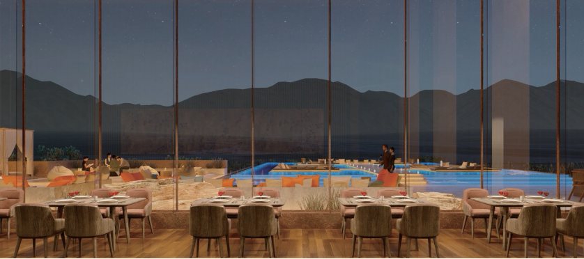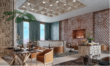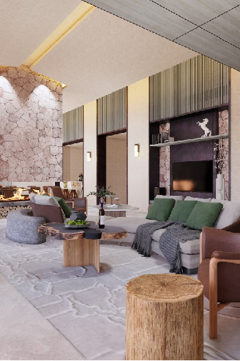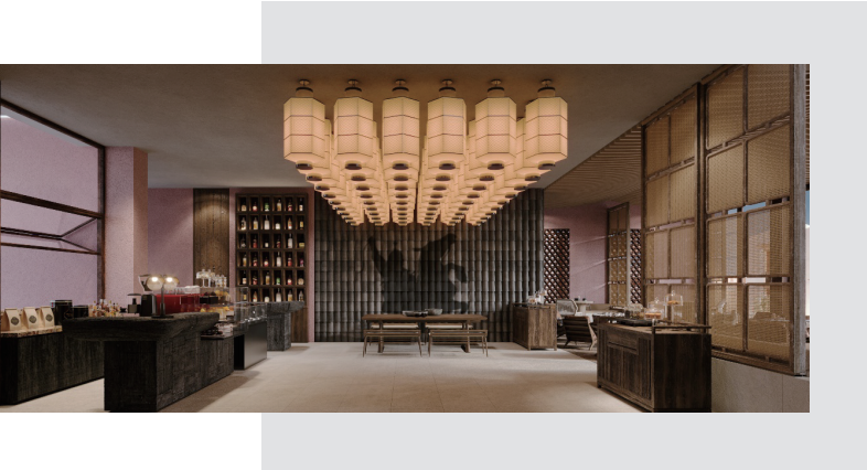 这里是连接前台和西餐厅,展现安漠酒店主楼主体特征的餐饮服务点,伴着贺兰山绝美景观,可在此享受下午茶,咖啡,无酒精鸡尾酒。这里放置适宜星空露台的围炉式产品,加之露台的安漠英文的主题LED灯箱,以安漠的主体文化露出,展现大堂酒廊包容综合的理念。