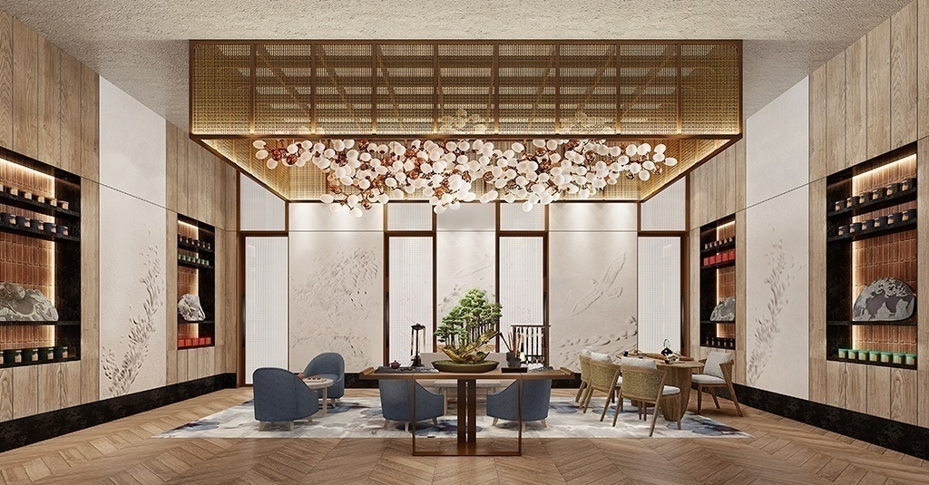 山海图命名来源于本地风土,背靠贺兰山父亲山,前卧黄河母亲河,造就了银川塞上江南的风土,图字取义于图兰朵葡萄酒文化小镇,主打菜系以江浙菜,闽菜和粤菜以及本地特色美食为主,以山海融合南北不同菜系,用粤语的英文名称也呼应了粤菜和闽菜的主导地位;餐厅整体呈现山河壮丽的设计元素。