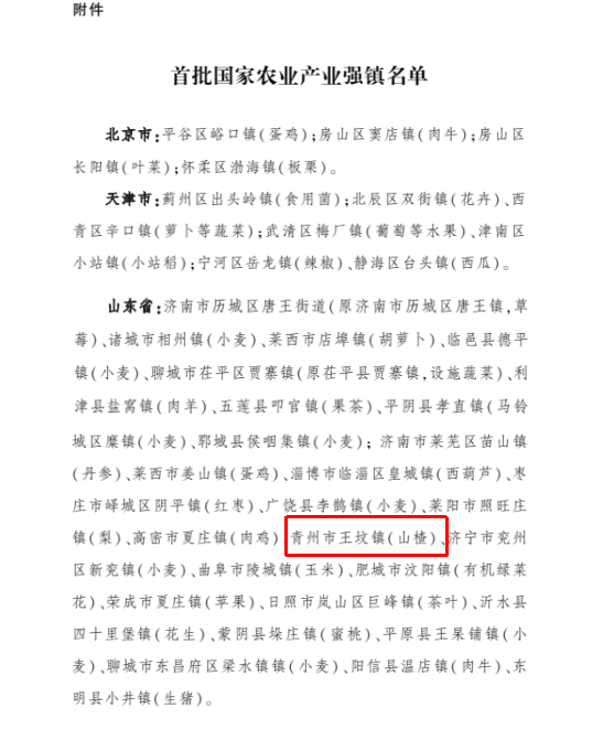 近日,农业农村部办公厅、财政部办公厅公布了首批国家农业产业强镇名单,我市王坟镇(山楂)成功获得认定。