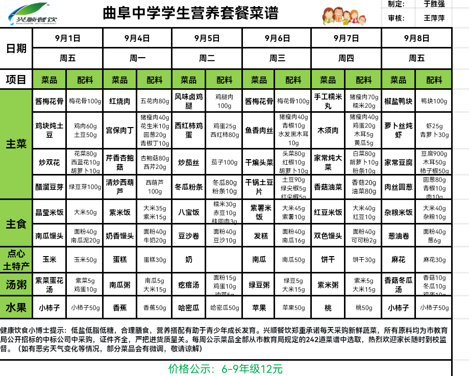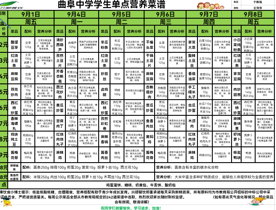 根据市教育局和区教育分局关于食堂“调价提质”的工作部署,现将曲阜中学学生餐饮改革情况向您公示!此次大宗食品原材料在市局统一公开招标后,通过入围的8大类品牌中,从品牌知名度、产品营养成分、家长认可度中优选本地知名企业荣光生产的品品香花生油、青岛凯乐面粉、产自黑龙江品牌大米;调味品优选海天、欣和等知名品牌;猪产品同样优选龙大品牌供应;鸡蛋同样优选独立包装的博海品牌;所有使用的大宗食品原材料均通过企业资质认证、产品品牌鉴定、索票索证存档、公司设置品牌质量监督小组,定期对食品原材料的使用严格把控监督。学校午餐单点模式:单点菜品价格2元-9元,共8-10个菜,荤素搭配,学生自主选择,主食0.8元(含米饭、馒头、粥,自主选择,吃饱为止),学生最低消费价格为2.8元。(原单点模式从历年实践情况看,适合不同口味学生,深受大家喜欢,经报请市、区教育局,同意保留此模式。)