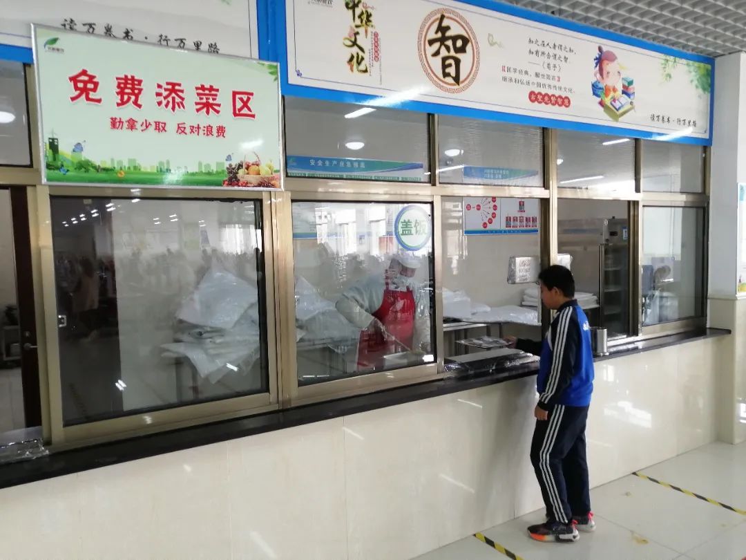 免费面食添加区包括米饭、馒头、粥,学生购买的饭菜自带一份米饭,面食吃完后,无需刷卡消费,面食可以免费不限量自己添加,勤拿少取,保证吃饱不浪费!五、健全常态化陪餐机制