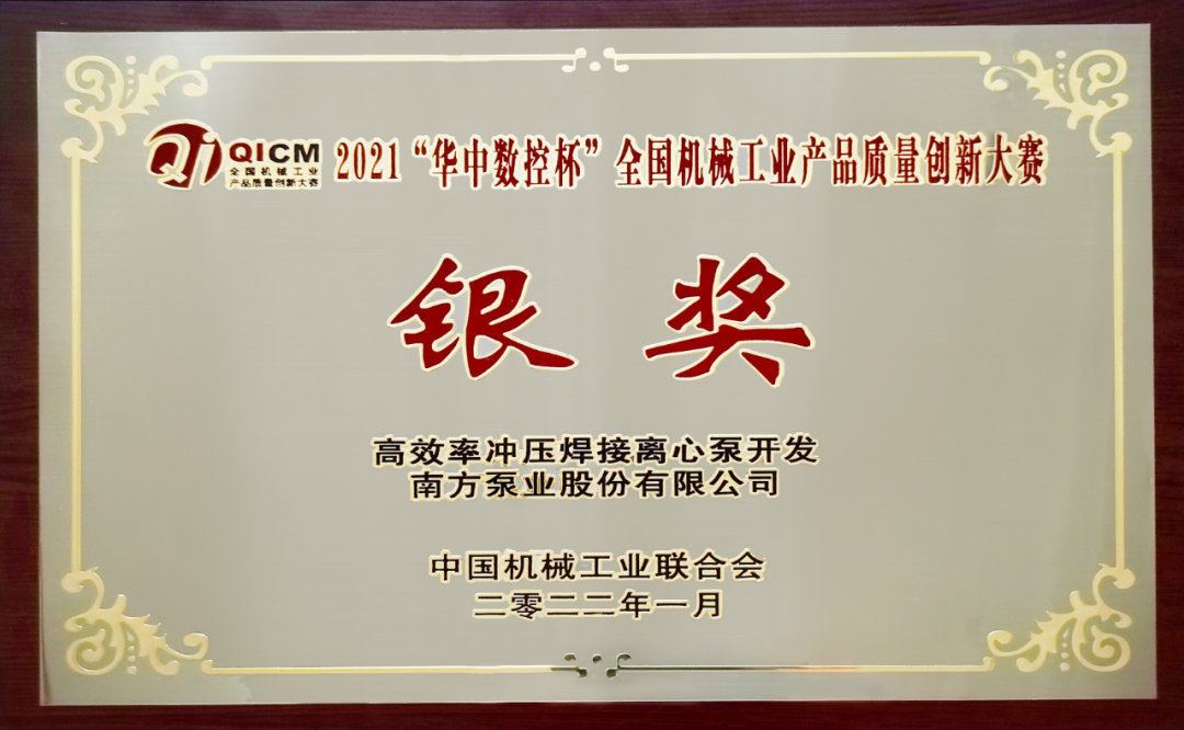 8月24日,由中国机械工业联合会主办的“华中数控杯”首届全国机械工业产品质量创新大赛颁奖盛典在宁夏银川市举行。经行业专家线上初赛评审、专业协会复审、决赛评审和社会公示等层层评选,南方泵业股份有限公司申报的“高效率冲压焊接离心泵开发”项目,在400余个项目中脱颖而出,荣获首届全国机械工业产品质量创新大赛银奖。