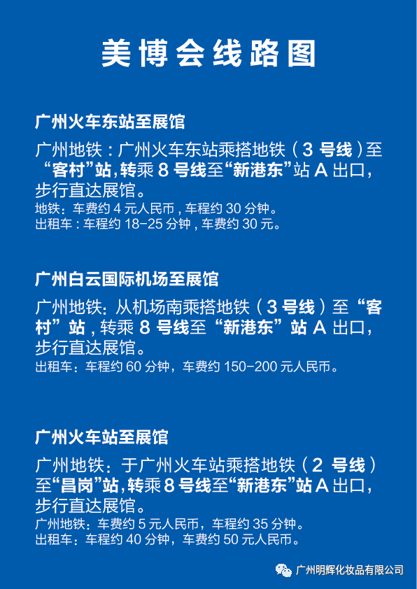 广州地铁服务时间为6:00 至23:30,车费为2至10元人民币不等,按分站收费, 地铁现共有6条路线横跨广州市区。离我们展位最近出口为新港东站A出口,详情可浏览广州地铁网页: www.gzmtr.com。