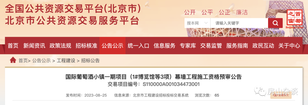 8月25日,北京市公共资源交易服务平台发布了国际葡萄酒小镇一期项目(1#博览馆等3项)幕墙工程施工资格预审公告。