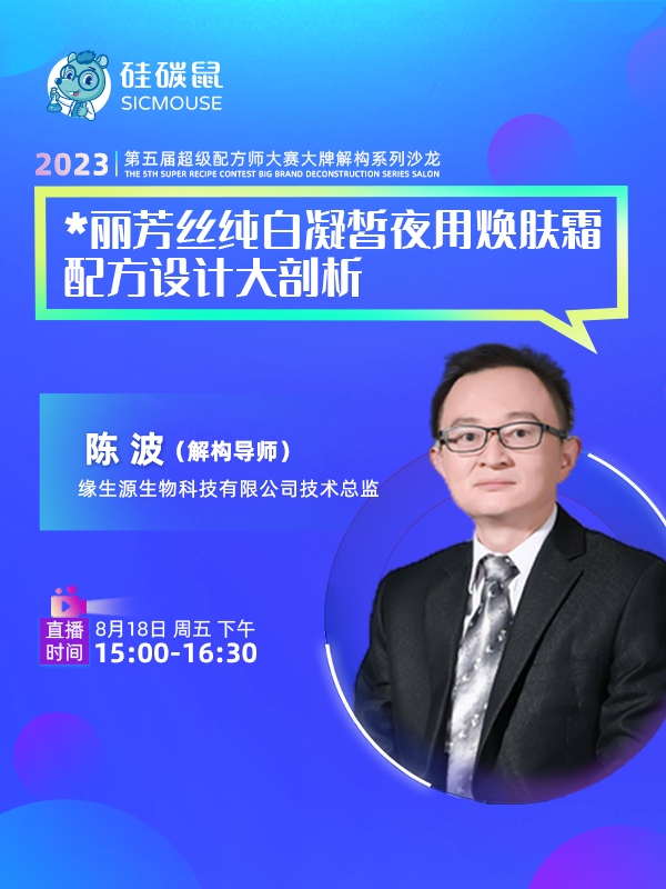 从技术角度讲,敏感肌功效型产品研发具有一定挑战性。具体来说,敏感肌的朋友们对于美白可不是"追求立竿见影"那么简单,他们注重的是循序渐进的温和美白,还要保肤养肤两不误。这导致配方师在研发产品时面临诸多难题,比如需要关注个性化护肤需求,需要综合考虑成分选择、浓度控制、稳定性、抗敏感性和舒缓功效等因素。同时,还需要参考临床研究和实践案例,并进行全面的安全性评估与测试等......8月18日,硅碳鼠配方大赛活动系列——与行业总工一起解构大牌配方沙龙活动第一期在广州举行。硅碳鼠邀请了(我司)缘生源生物科技技术总监陈波教授,从配方设计思路、核心原料应用、功效表达、成本核算等多维度全方位为大家详细解构*丽芳丝纯白凝皙夜用焕肤霜,帮助配方师深度学习大牌产品的研发思路,构创新研发思维。