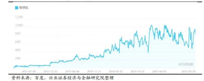 随着美妆市场高速发展,敏感肌作为护肤赛道的热门关键词被广泛关注。根据《中国敏感性皮肤诊治专家共识》,亚洲40%-56%的女性肌肤属于敏感肌,其中我国约36.1%女性属于敏感肌人群。预计到 2030 年,我国女性人口敏感肌人群将达到亚洲女性敏感肌人群的 48%。同时,有关“敏感肌”话题的讨论热度有增不减,百度的关键词检索数据显示,从 2013 年至今,“敏感肌”相关搜索指数上升了 10 倍+。百度“敏感肌”搜索指数趋势