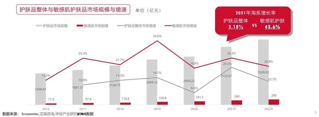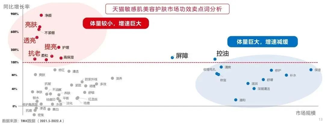 除了天生敏感肌,过度护肤、医美、环境污染、口罩等导致的皮肤敏感问题频发,肌肤屏障的破坏衍生出更多“后天敏感肌”群体,这也使得敏感肌市场的用户越来越壮大。根据淘宝天猫发布的《敏感肌市场趋势白皮书》,敏感肌护肤市场在2022年的规模竟然达到了290亿元,增长率还超过了27.0%,预计2025年将突破500亿,且敏感肌市场的增速远高于护肤市场的整体增速,该市场目前处于远未饱和的状态,潜力巨大。敏感肌护肤领域有两个大特点:人群肤质精细化和功效需求精细化。不同类型的敏感肌需要不同的呵护策略。而且,除了人群细分之外,消费者对敏感肌护肤的功效需求也越来越有讲究了。舒缓、修护等基础功效的产品增长规模相对较大,不过增速已经有所减缓。而美白、抗老等高级功效的产品增长迅猛,可见敏感肌人群对进阶功效的需求在狂飙!敏感肌抗老、美白赛道增速突出
