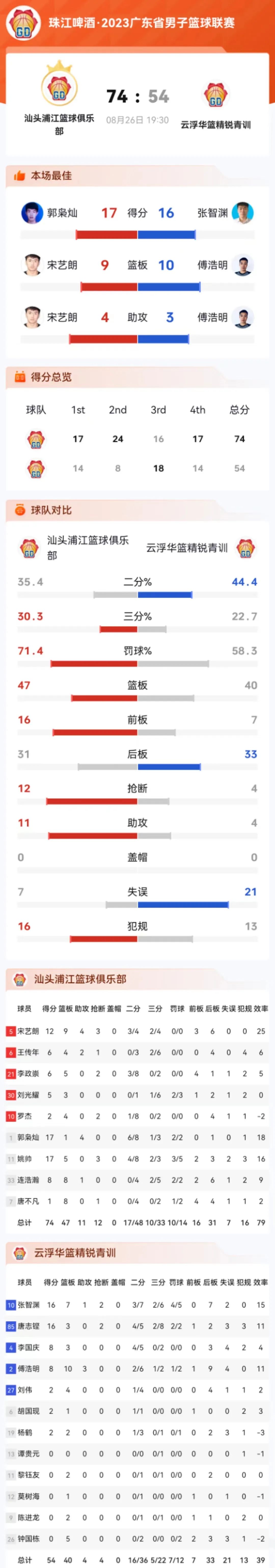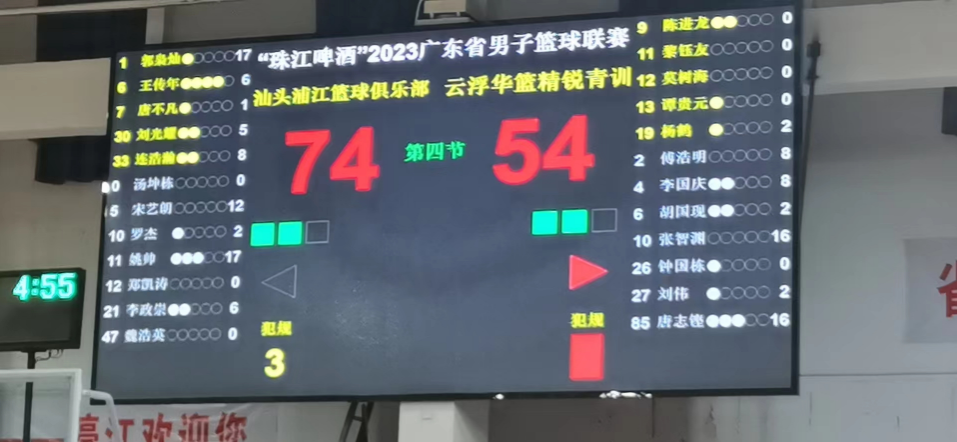 下半场,云浮队不甘落后,改变策略继续追分,将分差缩小,但也无力挽回。汕头队最终以74:54的比分结束比赛。