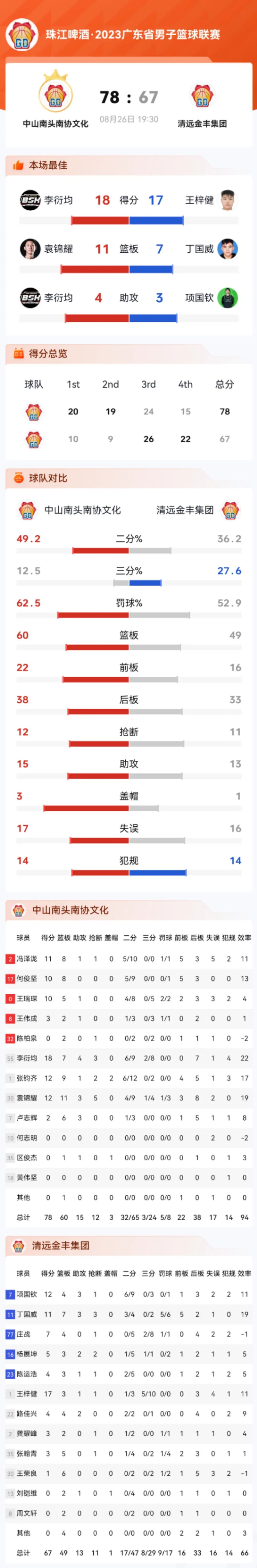 半场,中山队的出手次数比清远队多接近20次,机会是创造出来了,加上投手群发挥稳定。中山39:19清远。清远终于在下半场恢复活力,项国钦和庄战得分,分差在最后一分钟追至11分。最终比分中山78:67清远,中山在2017、2021年后再进四强。