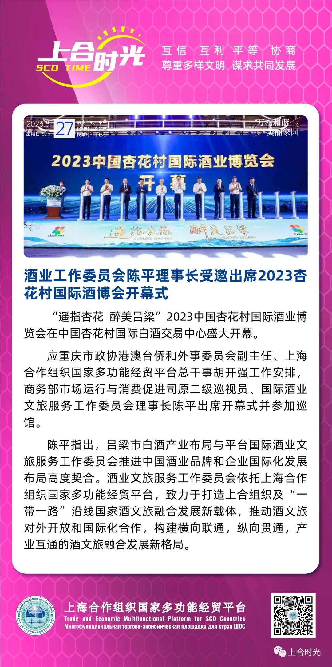 陈平指出,吕梁市白酒产业布局与平台国际酒业文旅服务工作委员会推进中国酒业品牌和企业国际化发展布局高度契合。酒业文旅服务工作委员会依托上海合作组织国家多功能经贸平台,发挥中国酒业文旅产业优势,围绕促进文化交流、引领技术创新、扩大贸易投资、传播产业文明、推动生态发展、助力品牌提升六个维度,传播中国酒文化,讲述中国酒故事,推广中国酒品牌,做好中国酒业的国际文化表达,致力于打造上合组织及“一带一路”沿线国家酒文旅融合发展新载体,推动酒文旅对外开放和国际化合作,构建横向联通,纵向贯通,产业互通的酒文旅融合发展新格局。