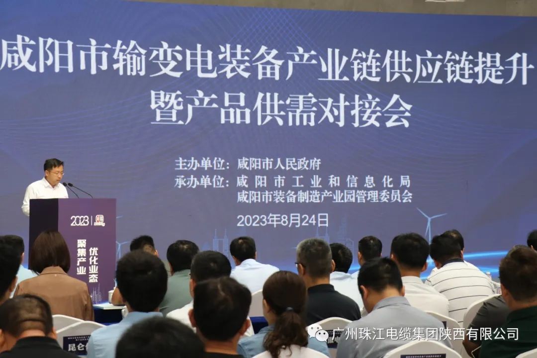 2023 年 8 月 24 日上午 09:30,由咸阳市人民政府主办、咸阳市工信局、咸阳装备制造产业园管委会协办的咸阳市输配电产业链供应链提升暨产品供需对接会如期在咸阳市装备制造园会议厅隆重举行,出席本次会议的有咸阳市副市长李忠平、市政府副秘书长吴凯、产业园管委会书记刘辉、市工信局局长李森及各区县主管工业的领导和园区重点企业代表约300余人参加,我公司作为本次输配电产业链骨干企业应邀参加了本次会议。