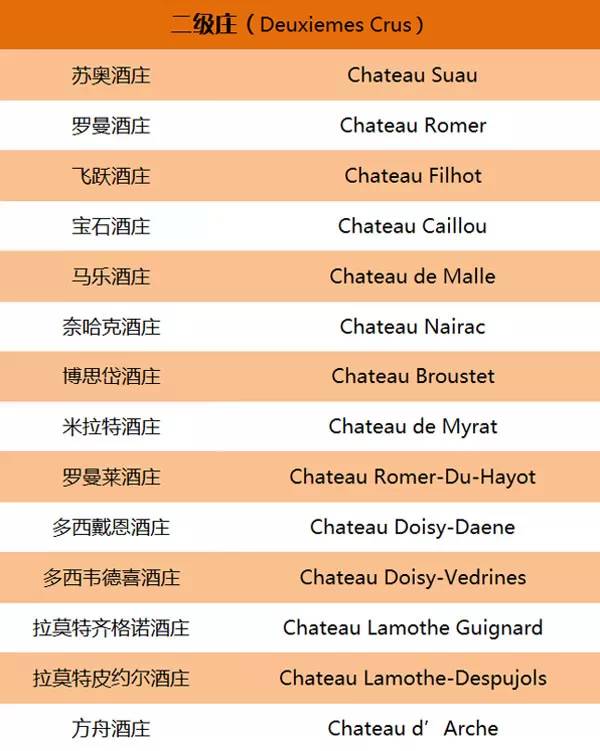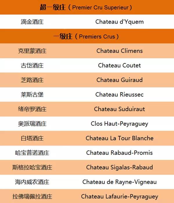 1855 年,苏玳地区的甜白葡萄酒酒庄分为三级,即超一级、一级和二级酒庄,共有 26 家酒庄入选,分别如下: