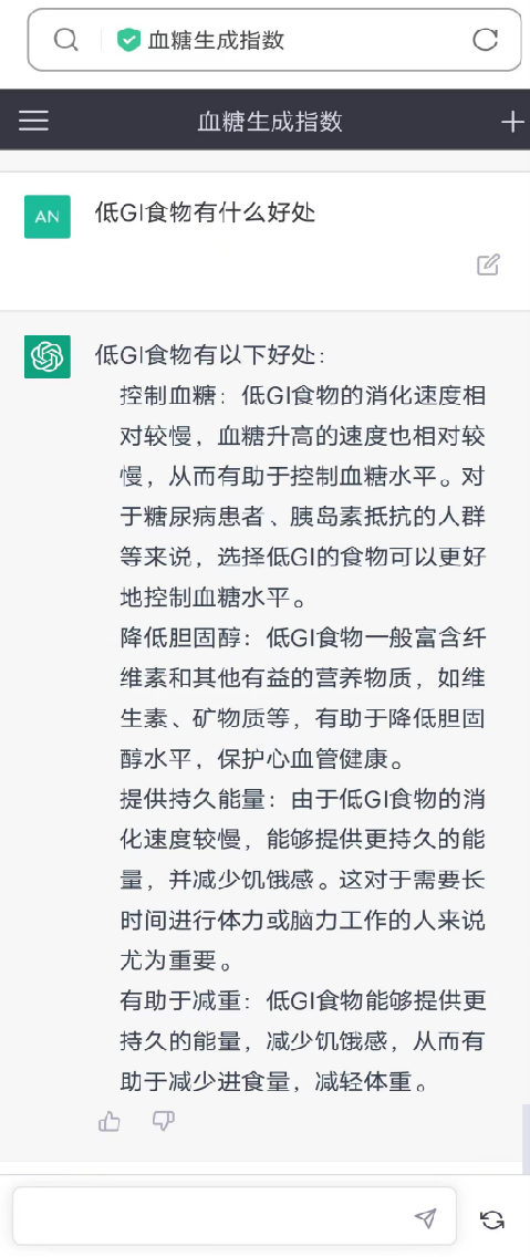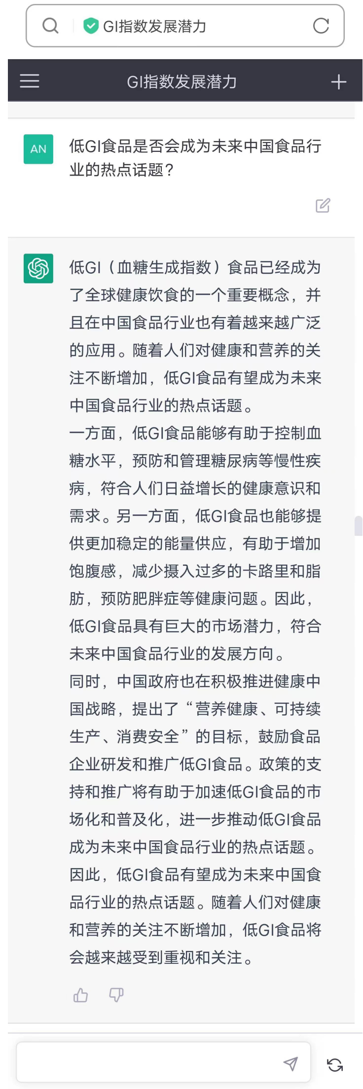 相信这类自然语言生成式模型会为以人工智能为特征的科技未来增添新动力,也相信我们持续在低GI食品行业研发、生产、科普、食育和推广的多维度工作,将为GI行业在我国食品产业的发展带来更多的动力和成果!