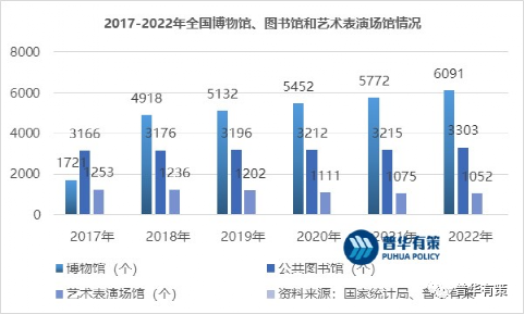 根据国家统计局公布数据,2022年国内博物馆数量6,091个、公共图书馆3,303个、艺术表演场馆1,052个。