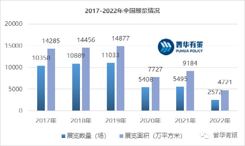 2021年,在疫情防控常态化形势下,中国经济总体上表现出较好复苏态势,中国展览业在2020年基础上继续恢复发展,展览数量和展览面积较上年均实现一定增长。根据《2022年度中国展览数据统计报告》,2022年,全国举办线下展览2,572场,展览总面积达4,721万平方米,较2021年减少2,923场和4,463万平方米,降幅分别为53.19%和48.60%。